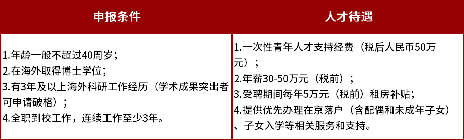 來校工作者,受聘期間享受國家和學(xué)校提供的薪金收入、相關(guān)福利待遇。對于博士畢業(yè)或博士后出站的新入職專任教師,學(xué)校為其提供總計稅前10萬元安家費和一定額度科研啟動經(jīng)費,為其在京落戶、子女入園入學(xué)提供相關(guān)服務(wù)與幫助,為優(yōu)秀人才開設(shè)“專業(yè)技術(shù)職務(wù)破格晉升通道”。