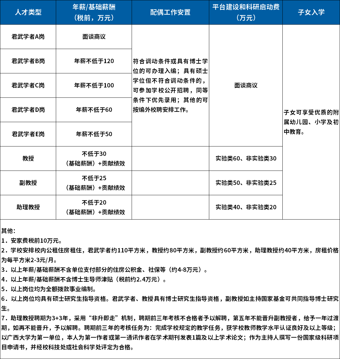 隨著我國(guó)“十四五”開啟全面建設(shè)社會(huì)主義現(xiàn)代化國(guó)家新征程,教育部和廣西壯族自治區(qū)黨委、政府更加高度重視廣西大學(xué)的建設(shè)改革發(fā)展,提供了系列政策支持和資金項(xiàng)目支持,學(xué)校進(jìn)入了多重發(fā)展機(jī)遇疊加期和跨越發(fā)展的快車道,力爭(zhēng)建校百年時(shí)建成特色鮮明的國(guó)內(nèi)一流綜合性研究型大學(xué)。我們比以往任何時(shí)候更加渴望優(yōu)秀學(xué)者加盟,我們極力創(chuàng)造適應(yīng)青年人才脫穎而出的學(xué)術(shù)生態(tài)和條件保障,提供比較優(yōu)越的薪酬待遇,為所有引進(jìn)人才提供國(guó)家事業(yè)編制,為君武學(xué)者安排配偶工作、為所有引進(jìn)人才的小孩提供一流的基礎(chǔ)教育,為所有引進(jìn)人才提供租住房。讓我們攜手助力廣西科教,共創(chuàng)西大百年輝煌!