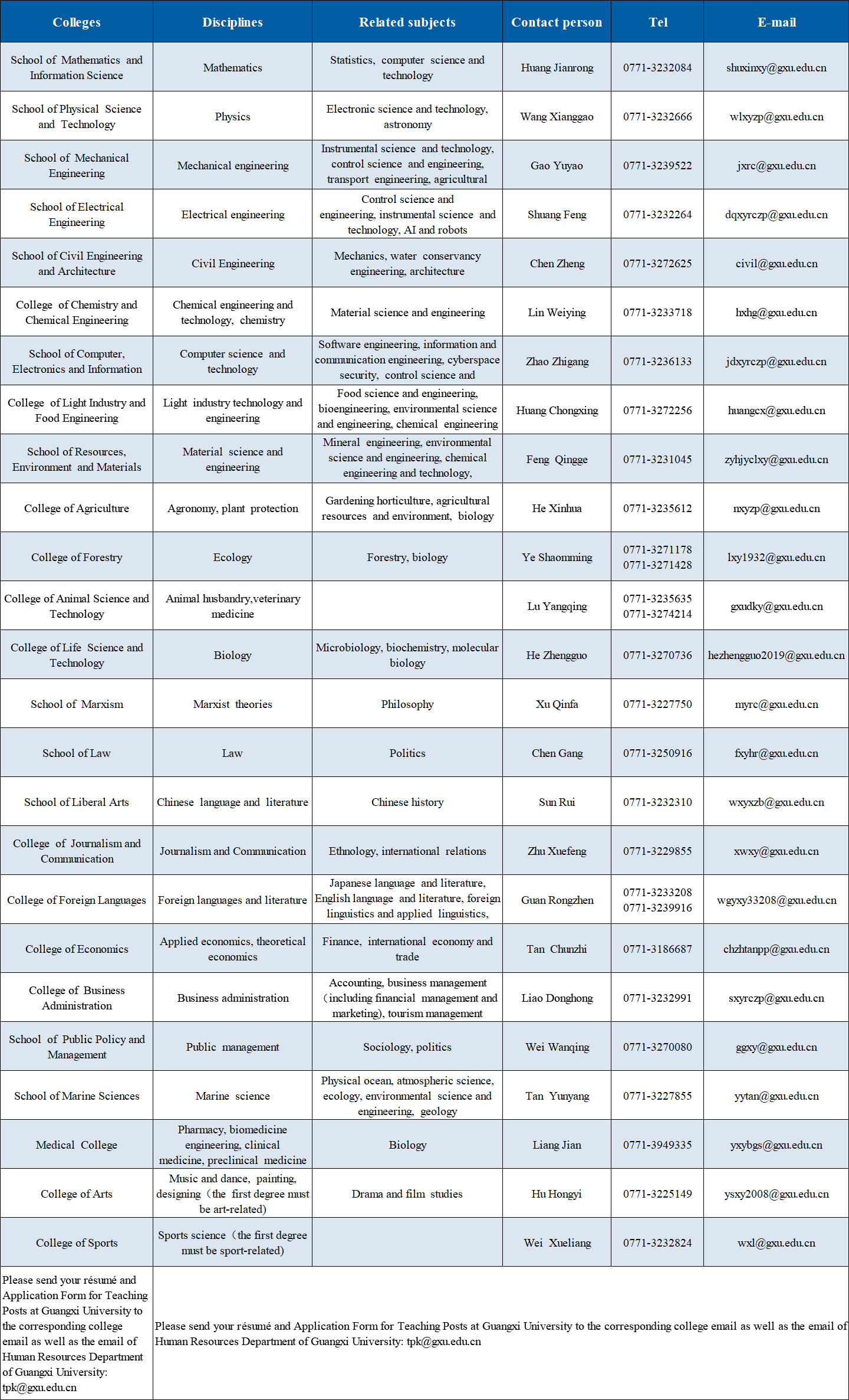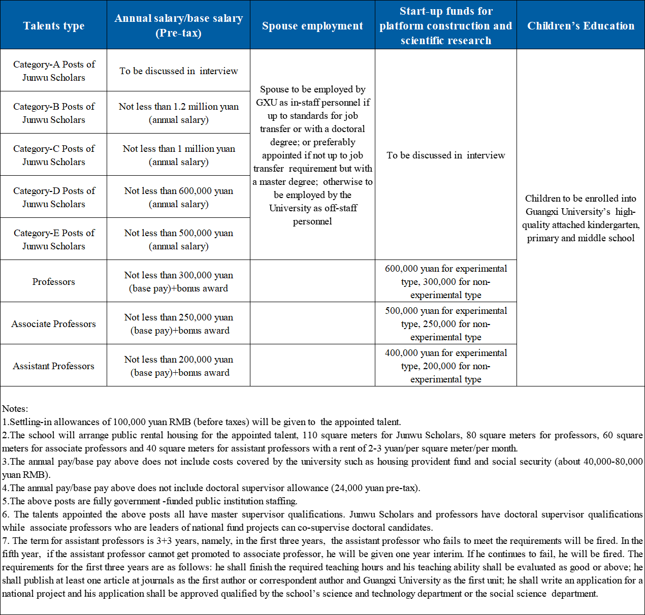 With the inauguration of China’s 14th Five-Year Plan to build a modernized socialist country, the Ministry of Education, the CPC committee and the government of Guangxi have attached increasing importance to the University’s development and innovation by offering policy and financial support. The school has entered the fast lane due to the overlapping of opportunities and leapfrog development with a vision to build it into a first class research-oriented university with distinctive features in China. The University is now more eager than ever to have more outstanding scholars join the staff. To serve that end, the University tries its best to build favorable academic ecology and conditions, offer competitive payment and public institution staffing, arrange jobs for their spouse, offer their children first-class elementary and secondary education, and settle housing for them. Let’s join hands to promote Guangxi’s science and education as well as usher in a brighter future of Guangxi University’s 100th anniversary!