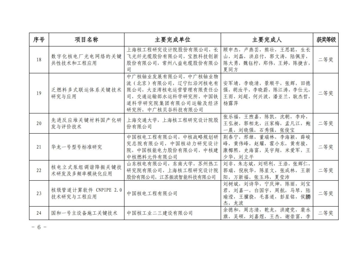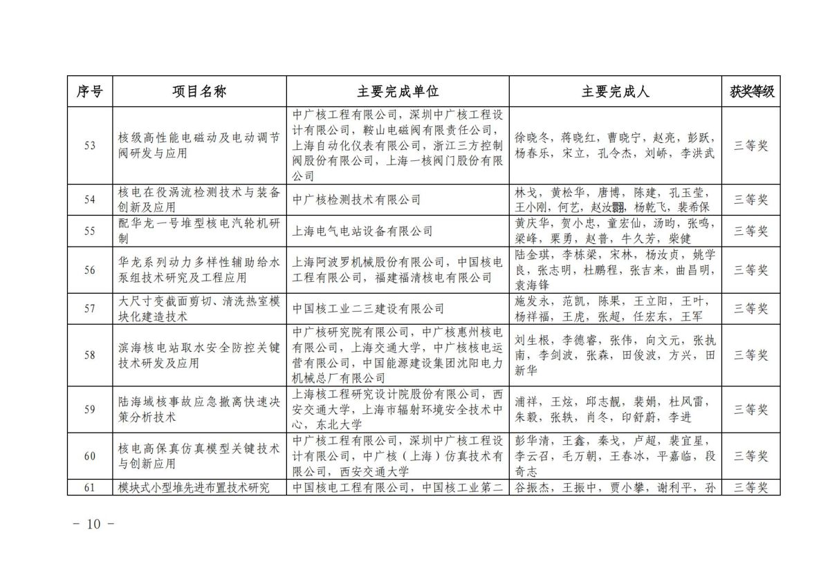 授予“核電廠水壓試驗(yàn)與在役檢查優(yōu)化研究及工程應(yīng)用”等6項(xiàng)成果科技進(jìn)步一等獎(jiǎng);授予“高溫氣冷堆示范工程安全評(píng)價(jià)關(guān)鍵技術(shù)及其應(yīng)用”等19項(xiàng)成果科技進(jìn)步二等獎(jiǎng);授予“石墨坩堝涂層激光微納燒結(jié)強(qiáng)化技術(shù)與裝備”等47項(xiàng)成果科技進(jìn)步三等獎(jiǎng)。