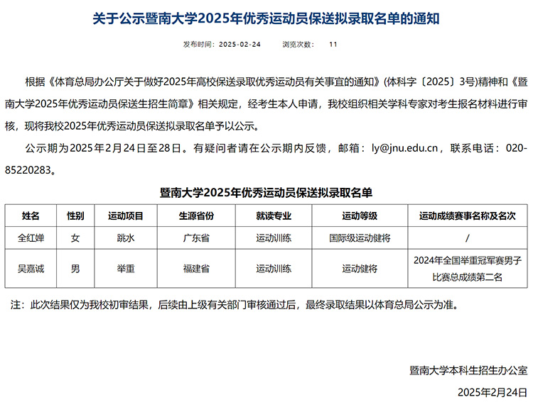 通知提到,根據《體育總局辦公廳關于做好2025年高校保送錄取優(yōu)秀運動員有關事宜的通知》(體科字〔2025〕3號)精神和《暨南大學2025年優(yōu)秀運動員保送生招生簡章》相關規(guī)定,經考生本人申請,該校組織相關學科專家對考生報名材料進行審核,現(xiàn)將該校2025年優(yōu)秀運動員保送擬錄取名單予以公示。