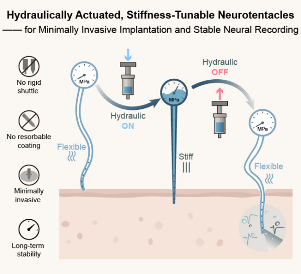 針對這一挑戰(zhàn),中國科學院心理研究所梁璟研究組與半導體研究所裴為華研究組合作,研發(fā)出剛?cè)峥烧{(diào)的“神經(jīng)觸手”式神經(jīng)探針(Neurotentacle)。該探針通過微型液壓系統(tǒng)調(diào)控內(nèi)部壓力,在插入階段可變得剛硬,精準穿刺腦組織;植入完成后恢復柔軟狀態(tài),適應腦組織微環(huán)境。這一方案無需借助任何硬質(zhì)導入工具,實現(xiàn)了低損傷植入與長期高質(zhì)量神經(jīng)信號記錄的雙重目標。實驗證實,該技術可減少急性損傷(相較傳統(tǒng)方法降低超過74%)、減輕慢性免疫反應(降低約40%),在小鼠長期在體記錄中保持優(yōu)異的神經(jīng)元信號質(zhì)量與信噪比,且信號通道的功能性和單位數(shù)量均優(yōu)于對照組。