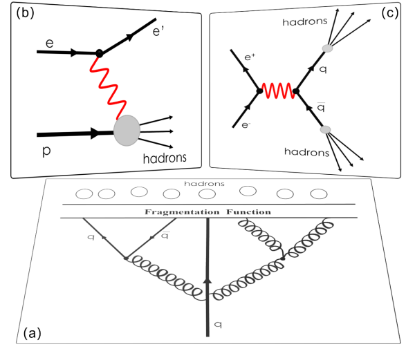 (a)部分子碎裂至強子過程示意圖,(b)電子-質(zhì)子半單舉深度非彈性散射過程示意圖,(c)正負電子湮滅過程示意圖