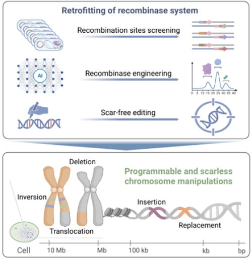 基因組編輯技術(shù)作為生命科學(xué)領(lǐng)域的一項重要突破,為基礎(chǔ)研究和應(yīng)用開發(fā)提供了技術(shù)支撐。以CRISPR及其衍生技術(shù)為代表的編輯系統(tǒng)通過可編程的向?qū)NA引導(dǎo)Cas9等核酸酶靶向基因組特定位點,被廣泛應(yīng)用于特定堿基和短片段DNA的精準(zhǔn)編輯。但是,大片段DNA編輯至今仍面臨挑戰(zhàn),對數(shù)千乃至數(shù)百萬堿基的精準(zhǔn)操縱更是領(lǐng)域的核心難題。突破該技術(shù)壁壘,將為實現(xiàn)大尺度基因組操縱提供關(guān)鍵支撐——包括基因關(guān)鍵區(qū)域的替換與修復(fù)、功能基因序列的完整插入、基因簇的刪減或重定位以及人工構(gòu)建基因組結(jié)構(gòu)變異等。這不僅可以推動遺傳操縱技術(shù)革新,更將成為疾病治療與作物改良技術(shù)瓶頸的突破口。理想的大片段DNA編輯工具可以同時支持染色體水平的多種編輯類型,包括精準(zhǔn)插入、替換、刪除、倒位與易位等。然而,現(xiàn)有工具在編輯效率、尺度、精準(zhǔn)性及類型多樣性等方面存在不足。