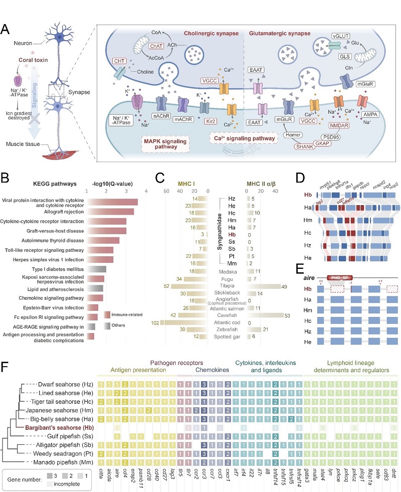 同時(shí),在豆丁海馬棲息柳珊瑚過程中,珊瑚分泌物對其生存是一把“雙刃劍”。一方面,豆丁海馬的神經(jīng)傳導(dǎo)和離子通道相關(guān)基因發(fā)生了快速進(jìn)化,這表明它們可能衍生出比珊瑚毒素更強(qiáng)的耐受或抵抗能力;另一方面,豆丁海馬能夠利用宿主珊瑚分泌物的免疫保護(hù)功能來抵御外源病原體,這可能與豆丁海馬大量丟失其免疫相關(guān)基因有協(xié)同演化關(guān)系。因此,研究認(rèn)為,這種“免疫精簡”策略可降低其能量消耗,并有助于其形成“雄性體內(nèi)懷孕”模式,有效避免了在胚胎著床過程中的免疫排斥反應(yīng)。這種高度依賴宿主并通過主動(dòng)“精簡”自身基因組來獲取生存優(yōu)勢的過程,恰好符合生物學(xué)中“黑皇后假說”(Black Queen Hypothesis)的典型例證,即舍棄某些“昂貴”的功能,依賴“伙伴”提供。