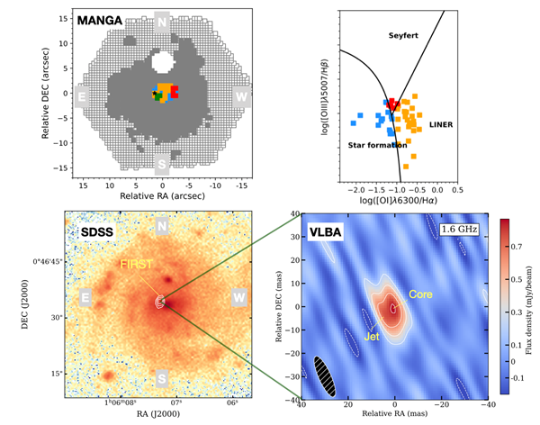 左上圖為光學(xué)積分視場(chǎng)單元光譜圖,右上圖為對(duì)應(yīng)像素的BPT診斷圖,利用星系光譜里幾條特定發(fā)射線的比例,來(lái)區(qū)分星系的電離源來(lái)自恒星形成和活動(dòng)星系核的貢獻(xiàn)。左下圖為光學(xué)觀測(cè)圖與射電FIRST巡天觀測(cè)等值線。右下圖射電射電甚長(zhǎng)基線干涉陣列VLBA觀測(cè)到的核-噴流結(jié)構(gòu)。