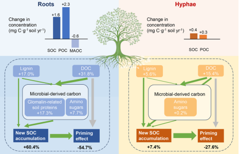 研究結(jié)果表明,根系對土壤有機碳的年均凈貢獻為1.2 mg C g-1土壤,是外延菌絲的近4倍。根系顯著促進了新碳的固定,還可抑制原有有機碳的分解,從而實現(xiàn)土壤碳的凈積累。根系輸入主要促進顆粒有機碳的積累。