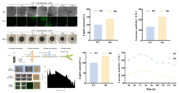 研究團隊在具有木質素降解能力的棒狀彎孢霉底盤菌株基礎上,構建了銅離子誘導的MCM5-AID堿基編輯系統(tǒng),在全基因組范圍內可隨機高效引入C-to-T和G-to-A突變,提升了菌株的遺傳多樣性。在此基礎上,團隊借助液滴微流控高通量篩選技術,選育出漆酶活性顯著提高的突變株M6,其漆酶活性達到228.58 U/L,較出發(fā)菌株提高了75%;在以木質素為主要碳源的搖瓶發(fā)酵條件下,突變株M6在保持菌體蛋白含量穩(wěn)定在33%的同時,油脂積累量達到細胞干重的49%;進一步,在5升發(fā)酵罐中進行擴大培養(yǎng)時,漆酶活性提升至240.43 U/L,菌體中油脂含量達51%,油脂與蛋白總含量占到菌體干重84%,展現(xiàn)出良好的穩(wěn)定性和工業(yè)化應用潛力。整合轉錄組與基因組分析發(fā)現(xiàn),突變株M6中脂肪酸合成、固醇代謝及甘油酯代謝途徑中的多個關鍵基因表達上調,同時與木質素降解相關的漆酶編碼基因也呈現(xiàn)高表達水平。這些協(xié)同調控效應推動了細胞內碳代謝流向脂質合成途徑的高效轉化,從分子機制上解釋了菌株性能提升的原因。