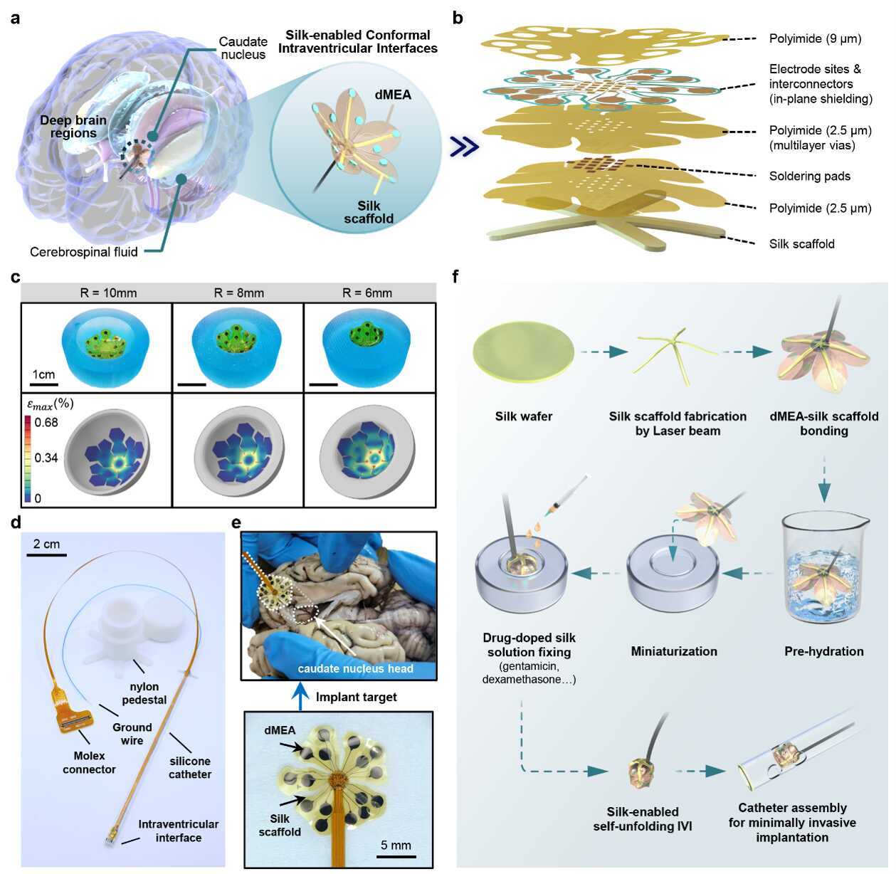 近日,中國科學院上海微系統(tǒng)與信息技術(shù)研究所研究團隊等,開發(fā)出蠶絲蛋白賦能的微創(chuàng)植入式腦室內(nèi)柔性神經(jīng)界面。該柔性神經(jīng)界面可在腦脊液環(huán)境中自展開,適形貼附深腦核團及腦室等大腦“內(nèi)表面”,并可長期在體監(jiān)測,為深腦核團相關(guān)神經(jīng)疾病解析提供了新的技術(shù)手段。
