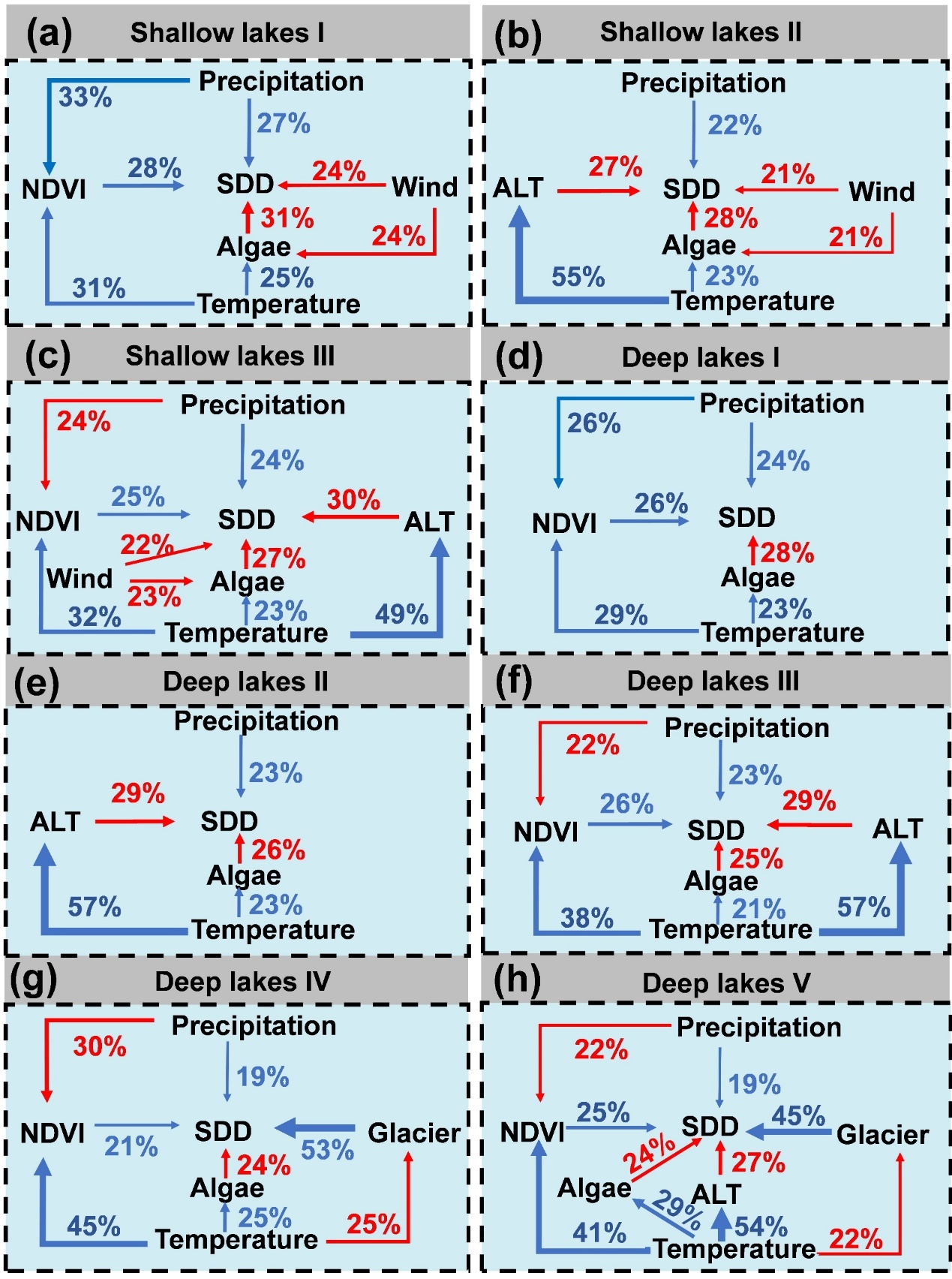 研究顯示,全球約67%的湖泊透明度出現下降趨勢。其中,39%的湖泊下降顯著,全球平均透明度下降幅度約為13%。這種變化反映了氣候變暖對湖泊生態(tài)系統(tǒng)產生的影響。在北美和歐洲,隨著氣溫升高,永久凍土融化和藻類增殖成為透明度下降的重要因素;在亞洲地區(qū),約44%的湖泊透明度有所上升。研究認為,這一現象主要與流域景觀“變綠”有關,即流域植被恢復減少了外源污染和泥沙輸入,從而改善了湖泊水質。