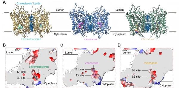 研究團(tuán)隊(duì)分別解析了人源NET與抗抑郁藥物左米那普侖、維拉佐酮,以及NET與多巴胺轉(zhuǎn)運(yùn)體雙重再攝取抑制劑伐諾司林結(jié)合的三個(gè)冷凍電鏡結(jié)構(gòu),分辨率達(dá)2.44?至2.52 ?。研究顯示,三種復(fù)合物中,NET均呈現(xiàn)內(nèi)向開放構(gòu)象。其中,左米那普侖結(jié)合于NET內(nèi)向開放構(gòu)象特異的新型變構(gòu)位點(diǎn)。該位點(diǎn)被命名為S3,以區(qū)別于中央正構(gòu)位點(diǎn)S1和位于靠近胞外區(qū)的外向開放構(gòu)象變構(gòu)位點(diǎn)S2。與之不同,維拉佐酮和伐諾司林同時(shí)占據(jù)S1與S3位點(diǎn)。