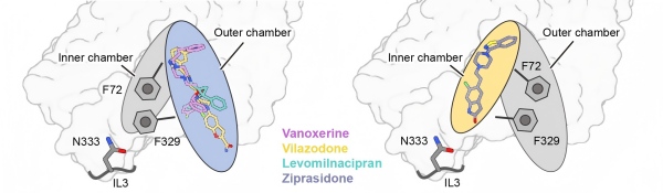 團(tuán)隊(duì)通過對三個(gè)復(fù)合物結(jié)構(gòu)精細(xì)分析,并與已報(bào)道的齊拉西酮–NET復(fù)合物進(jìn)行結(jié)構(gòu)比較,結(jié)合分子對接結(jié)果,提出了NET抑制劑識別的“瓣膜模型”,即NET內(nèi)向開放空腔中的兩個(gè)關(guān)鍵苯丙氨酸殘基F72和F329如同“心臟瓣膜”,其側(cè)鏈相對排列,且側(cè)鏈構(gòu)象隨不同抑制劑的結(jié)合而發(fā)生改變。這兩個(gè)殘基將內(nèi)向開放空腔分隔為內(nèi)室與外室兩個(gè)非對稱區(qū)域。不同化學(xué)結(jié)構(gòu)的抑制劑被“瓣膜”引導(dǎo)結(jié)合至不同區(qū)域,如左米那普侖、維拉佐酮及伐諾司林結(jié)合于外室,齊拉西酮結(jié)合于內(nèi)室。該模型揭示了NET如何特異性識別結(jié)構(gòu)多樣的抑制劑,為理性藥物設(shè)計(jì)提供了新的理論框架。