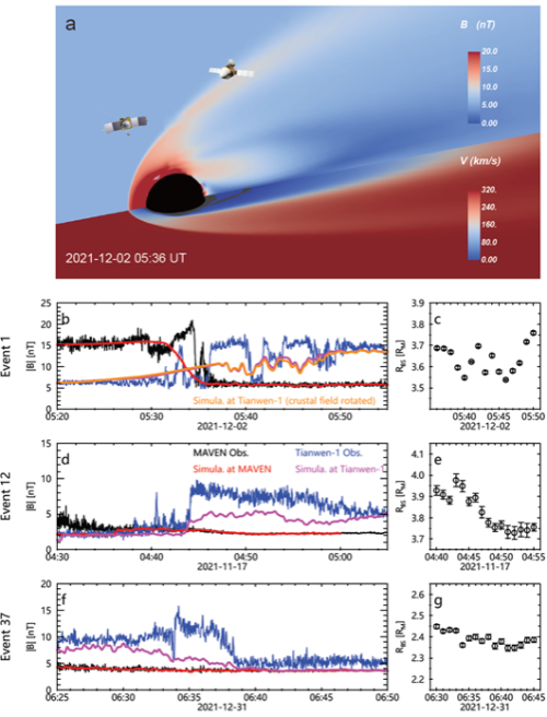 火星弓激波是超磁聲速太陽風在火星附近減速為亞磁聲速并發(fā)生偏轉(zhuǎn)的區(qū)域,其位置反映了太陽風與火星空間環(huán)境相互作用的強度。研究發(fā)現(xiàn),火星弓激波位置受太陽極紫外輻射、太陽風動壓、行星際磁場強度和方向等參數(shù)的影響??蒲袌F隊曾對太陽風擾動下火星弓激波的振蕩現(xiàn)象開展研究。然而,針對弱太陽風擾動這一特定情況,其物理過程尚不清晰。在前期工作的基礎上,利用天問一號環(huán)繞器與MAVEN探測器的聯(lián)合觀測數(shù)據(jù),團隊對弱太陽風擾動條件下火星弓激波的振蕩行為展開深入分析。