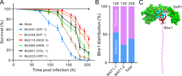 在白僵菌種群遺傳研究的基礎(chǔ)上,科研團(tuán)隊(duì)針對(duì)近300個(gè)球孢白僵菌菌株,以原始分離寄主的昆蟲目為單元進(jìn)行分組并開展研究。基因組關(guān)聯(lián)分析顯示,初始分離自雙翅昆蟲的菌株基因組存在兩個(gè)異常位點(diǎn)。團(tuán)隊(duì)進(jìn)一步針對(duì)不同位點(diǎn)編碼基因進(jìn)行基因缺失及生物測(cè)定,獲得影響白僵菌感染蠅類昆蟲的潛在效應(yīng)子基因Bhe1。Bhe1在不同菌株中存在有無的二元分布特征,編碼蛋白也存在長(zhǎng)度差異。同時(shí),Bhe1缺失突變株感染雙翅目的蚊蟲及其他目昆蟲的毒力不受影響。