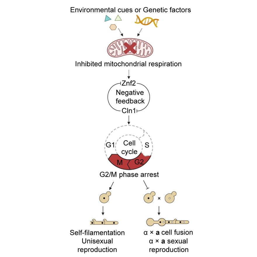 研究團隊通過大規(guī)模T-DNA插入突變篩選,發(fā)現(xiàn)了一系列同性生殖能力增強,且雙性生殖能力明顯減弱的突變體,這暗示兩種有性生殖模式之間存在相互抑制的關(guān)系。基因組測序結(jié)果顯示,這些突變體的T-DNA插入位點富集于呼吸作用相關(guān)基因中。后續(xù)功能實驗表明,抑制呼吸作用可上調(diào)關(guān)鍵轉(zhuǎn)錄因子Znf2的表達,進而直接抑制B型細(xì)胞周期蛋白Cln1,最終導(dǎo)致細(xì)胞周期停滯于G2/M期。這種細(xì)胞周期停滯狀態(tài)一方面促進了同性生殖發(fā)育,另一方面抑制了雙性生殖過程中的細(xì)胞融合過程。