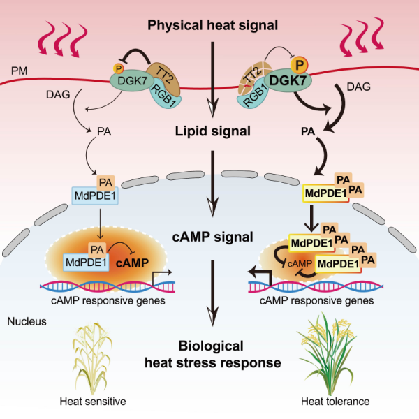 為解析PA信號的后續(xù)傳遞機制,團隊通過功能域篩選,鑒定到具有PA結合域和磷酸二酯酶催化域的雙功能蛋白MdPDE1。該蛋白能夠感知PA濃度變化,與PA結合并被激活,轉移到細胞核中,通過水解環(huán)磷酸腺苷(cAMP)降低核內cAMP水平,完成脂質信號向cAMP信號第二步轉換。點突變實驗證實,MdPDE1的PA結合能力是其核定位與功能執(zhí)行的關鍵。最終,核內cAMP水平下降觸發(fā)轉錄重編程,上調小熱激蛋白和活性氧清除酶等相關基因的表達,從而在細胞層面建立起一套完整的耐熱響應機制,能夠顯著增強水稻的高溫耐受能力。G蛋白—DGK7—PA—MdPDE1—cAMP信號途徑的完整解析,闡明了植物從細胞膜感知到核內基因表達調控的熱信號全程解碼機制,為剖析植物逆境響應機制提供了新的分子框架。