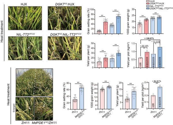 定向遺傳改良在模擬高溫的田間試驗中取得成效:DGK7或MdPDE1的單基因改良的水稻株系比對照株系增產50%至60%;TT2協(xié)同DGK7的雙基因改良株系比對照株系產量提升約1倍、米質改良明顯,且正常條件下對產量性狀無負效應。這表明,基于該通路的精準育種設計可實現(xiàn)耐熱表型的梯度化調控,為水稻、小麥、玉米等主糧作物應對不同強度的高溫脅迫提供了靈活的定制化解決方案,從而為育種家培育“高產高抗”作物新品種提供了重要的理論依據(jù)和基因資源。