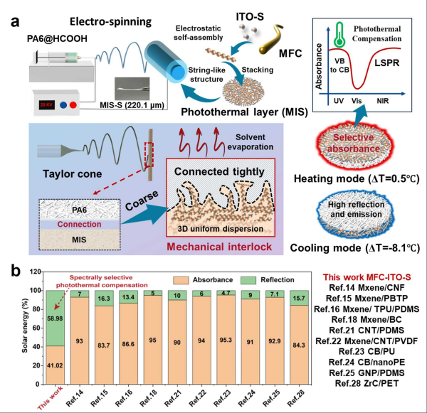 中國(guó)科學(xué)院寧波材料技術(shù)與工程研究所此前圍繞纖維素基功能材料開展了研究。近日,研究團(tuán)隊(duì)設(shè)計(jì)了光譜選擇性光熱補(bǔ)償策略:基于微纖化纖維素特有的一維形貌和高中紅外發(fā)射率本質(zhì),以及納米氧化銦錫(ITO)擁有的光譜選擇性光熱轉(zhuǎn)化能力,通過(guò)靜電自組裝得到三維均勻分散的微纖化纖維素(MFC)/納米ITO復(fù)合體(MIS),進(jìn)而通過(guò)原位靜電紡絲,將聚己內(nèi)酰胺冷卻層結(jié)合在串狀納米ITO/MFC光熱層基底上,制備出MIS-S膜。該材料在加熱模式下,展現(xiàn)出特殊的選擇性光熱補(bǔ)償,有助于將內(nèi)環(huán)境溫度提高0.5℃,并能夠防止過(guò)熱。在冷卻模式下,該材料也實(shí)現(xiàn)了8.1 ℃的降溫效果。