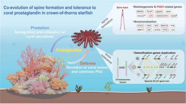 該研究聚焦珊瑚敵害物種防控問題,以南海珊瑚礁區(qū)域的長棘海星為對(duì)象,探究其適應(yīng)與演化規(guī)律。研究揭示了長棘海星基因組結(jié)構(gòu)演化特征,發(fā)現(xiàn)其基因座復(fù)制導(dǎo)致負(fù)責(zé)前列腺素轉(zhuǎn)運(yùn)的蛋白基因(SLCO家族)明顯擴(kuò)增。分析表明,SLCO基因擴(kuò)張時(shí)間與珊瑚繁茂時(shí)期相對(duì)應(yīng),這從側(cè)面揭示了長棘海星對(duì)珊瑚分泌物中毒性前列腺素E2(PGE2)的適應(yīng)性進(jìn)化策略。結(jié)合棘皮動(dòng)物普遍缺乏內(nèi)源PGE2合成途徑的特征,研究推斷,長棘海星或通過感知并利用珊瑚來源的外源PGE2信號(hào),激活骨骼形成相關(guān)基因調(diào)控通路,從而促進(jìn)棘刺與體型生長。