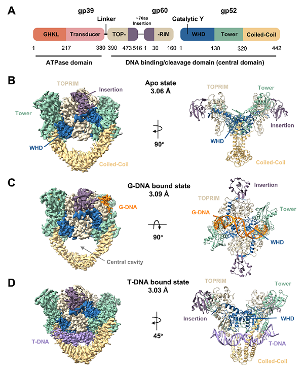 T4噬菌體II型DNA拓?fù)洚悩?gòu)酶中心結(jié)構(gòu)域Apo狀態(tài)、結(jié)合G-DNA以及結(jié)合T-DNA的冷凍電鏡結(jié)構(gòu)