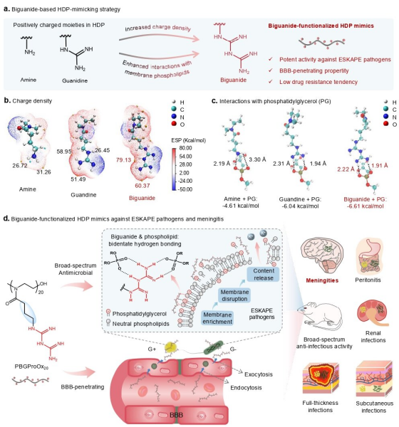 中國科學院蘇州生物醫(yī)學工程技術研究所提出了“雙胍可作為新型宿主防御肽模擬物側(cè)鏈正電荷基團”的創(chuàng)新策略。研究基于雙胍官能團高電荷密度與強磷脂結(jié)合力的特性,實現(xiàn)了雙胍化聚合物對ESKAPE耐藥菌的高效廣譜破膜殺菌性能,且長期處理不會誘導細菌產(chǎn)生耐藥性與交叉耐藥性。