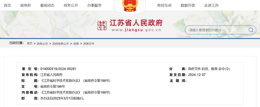 第三十七條 本辦法自2025年3月1日起施行。2010年3月24日江蘇省人民政府發(fā)布的《江蘇省科學技術獎勵辦法》(江蘇省人民政府令第61號)同時廢止。