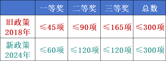 新版政策的一等獎授獎總數從不超過45項變更為不超過60項;二等獎授獎總數從不超過90項變更為不超過120項,三等獎數量從不超過165項變更為不超過120項。