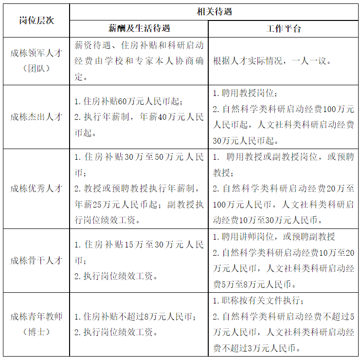 “成棟英才引進(jìn)計劃”招聘各崗位均為事業(yè)編制,符合條件者可享受黑龍江省高層次人才服務(wù)政策,為出入境、落戶、醫(yī)療、出行、配偶安置及子女入學(xué)等提供便利,學(xué)校提供具體待遇如下: