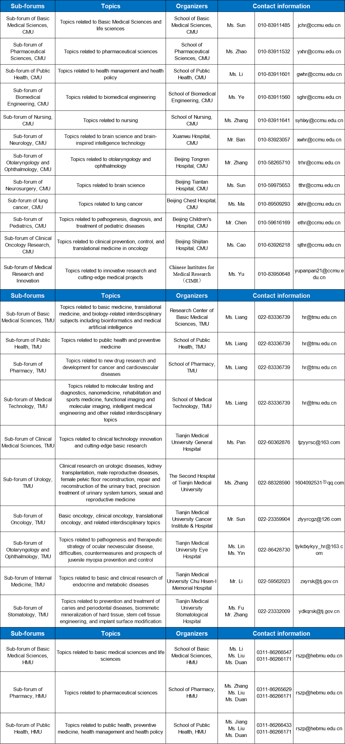 The sub-forums will be held on November 7-9, 2023(Beijing Time) (the specific time and place will be notified according to the arrangement of each school/college/clinical medical school). The sub-forums include policy introduction, academic presentations and academic exchanges.