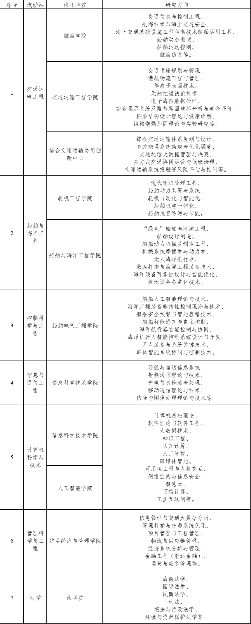 學校現(xiàn)有交通運輸工程、船舶與海洋工程、信息與通信工程、法學、管理科學與工程、計算機科學與技術(shù)、控制科學與工程等7個博士后流動站。