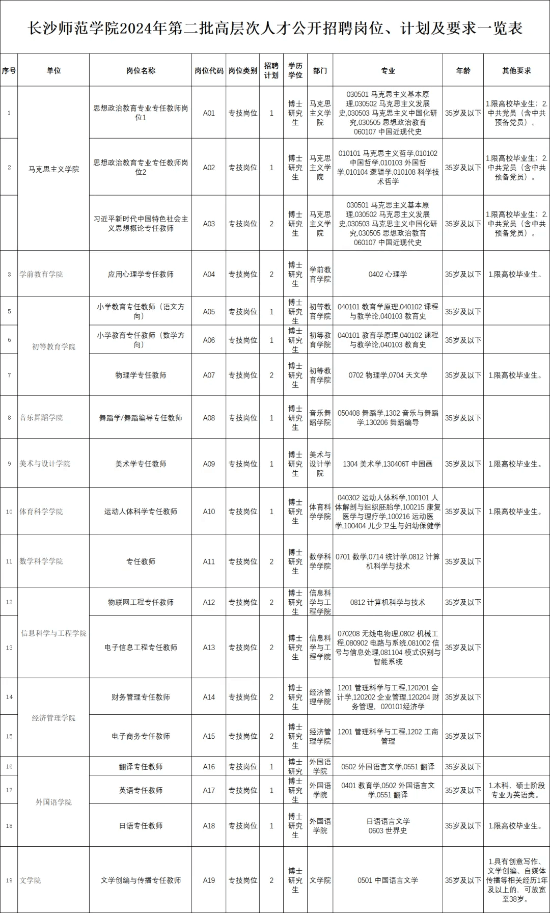 此次招聘崗位19個(gè),招聘計(jì)劃28名,詳見《長(zhǎng)沙師范學(xué)院2024年第二批高層次人才公開招聘崗位、計(jì)劃及要求一覽表》(附件)。學(xué)術(shù)領(lǐng)軍人才、學(xué)術(shù)拔尖人才等不受此計(jì)劃條件限制,一人一議,一事一策(詳見說明事項(xiàng)1)。