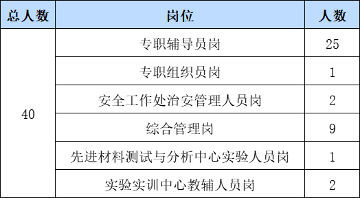 為滿足我校用人需求,擬面向社會公開招聘工作人員40人,其中專職輔導(dǎo)員25人、管理人員12人(專職組織員1人、安全工作處治安管理人員2人、綜合管理人員9人)、先進材料測試與分析中心實驗人員1人、實驗實訓(xùn)中心教輔人員2人,現(xiàn)將有關(guān)事項公告如下: