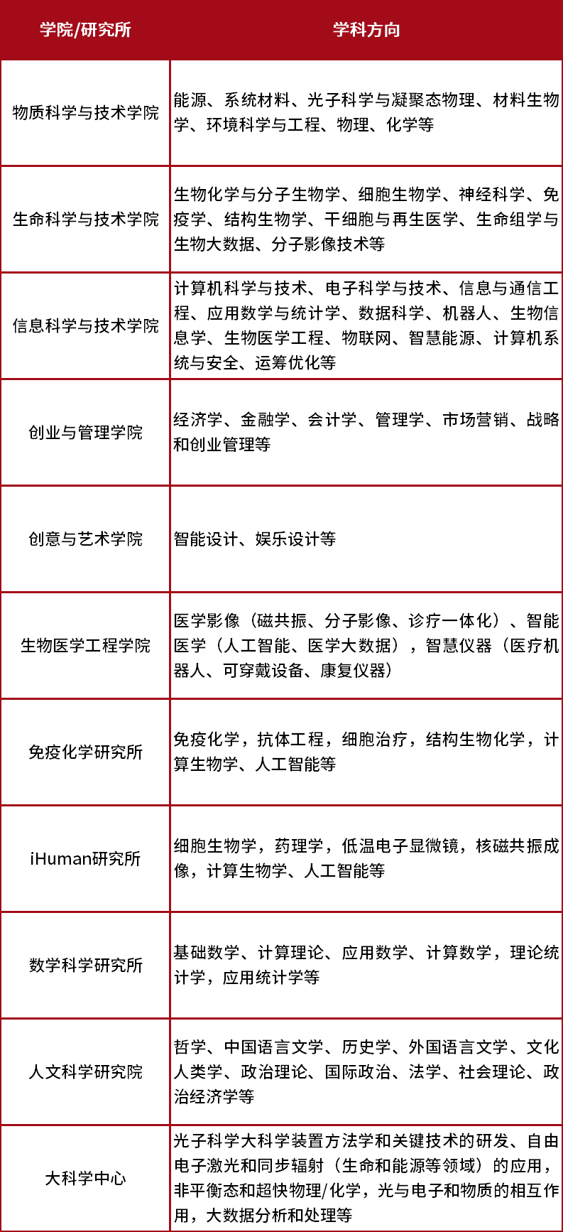學校以理工科為主,設立物質科學與技術學院、生命科學與技術學院、信息科學與技術學院、創(chuàng)業(yè)與管理學院、創(chuàng)意與藝術學院、人文科學研究院和生物醫(yī)學工程學院,實行大學院制,學院下不設系。學校設立免疫化學研究所、iHuman研究所、數(shù)學科學研究所、大科學中心。