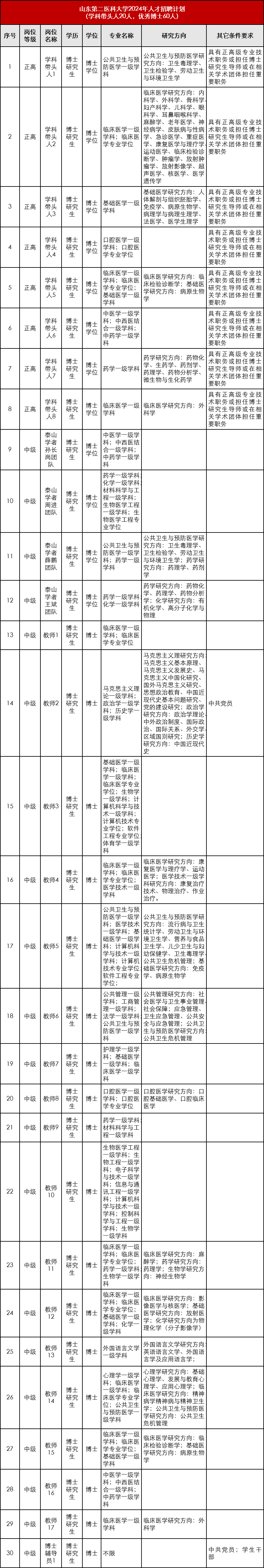根據(jù)省委組織部、省人力資源和社會(huì)保障廳《關(guān)于印發(fā)2024年度省屬事業(yè)單位公開招聘工作實(shí)施方案的通知》(魯人社發(fā)〔2023〕14號(hào))要求,結(jié)合工作需要,我校擬面向社會(huì)公開招聘高級(jí)崗位工作人員20名,其中正高級(jí)工作人員20名。招聘中級(jí)專業(yè)技術(shù)崗位工作人員60名。具體崗位及條件詳見《省屬事業(yè)單位公開招聘工作人員崗位匯總表》(附表1)。