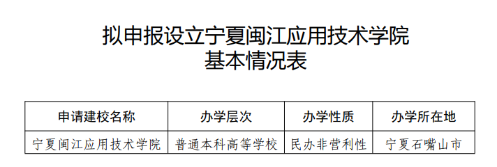 11月18日,寧夏回族自治區(qū)教育廳網(wǎng)站發(fā)布《關(guān)于擬申報(bào)設(shè)立寧夏閩江應(yīng)用技術(shù)學(xué)院的公示》,公示指出根據(jù)《中華人民共和國(guó)高等教育法》《普通高等學(xué)校設(shè)置暫行條例》《普通本科學(xué)校設(shè)置暫行規(guī)定》等有關(guān)規(guī)定,經(jīng)寧夏回族自治區(qū)教育廳組織專家組考察評(píng)議、教育廳黨組會(huì)議審議,擬向教育部申報(bào)“設(shè)立寧夏閩江應(yīng)用技術(shù)學(xué)院”事項(xiàng),現(xiàn)予以公示,公示期為2025年11月18日至11月22日。